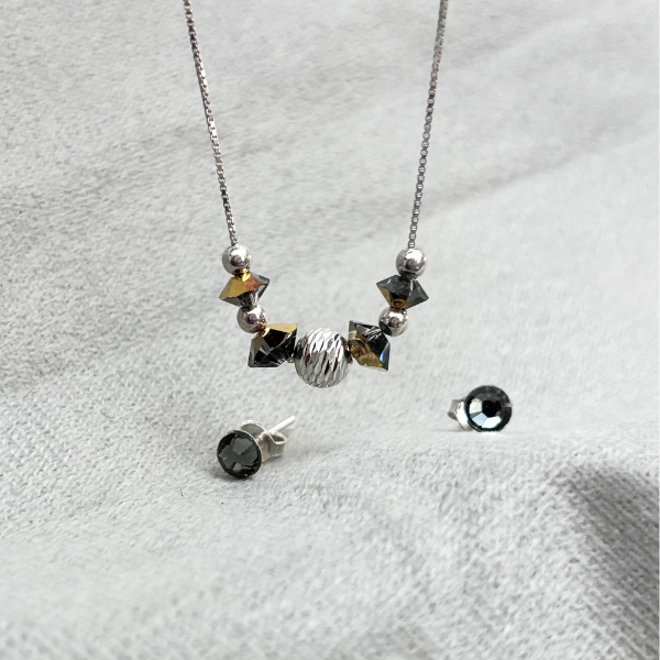 Elegante collar, elaborado con cristales Preciosa que capturan la luz de manera excepcional, y bolitas de plata que aportan un toque de sofisticación.